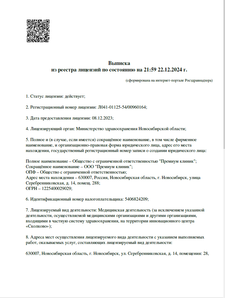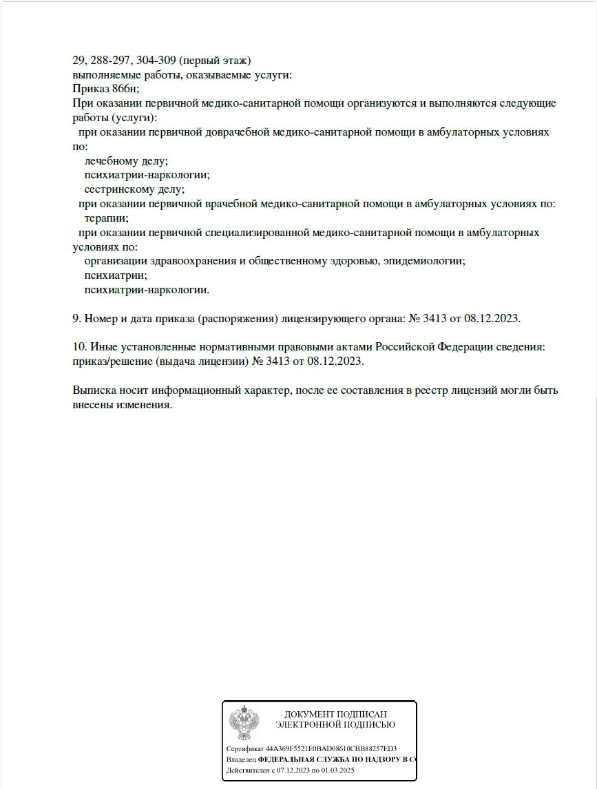 1. Сотрудниками гарантирована полная конфиденциальность. Исключено поступление сведений о проведенном лечении в государственные надзорные органы, пациент не состоит на психоневрологическом учете.